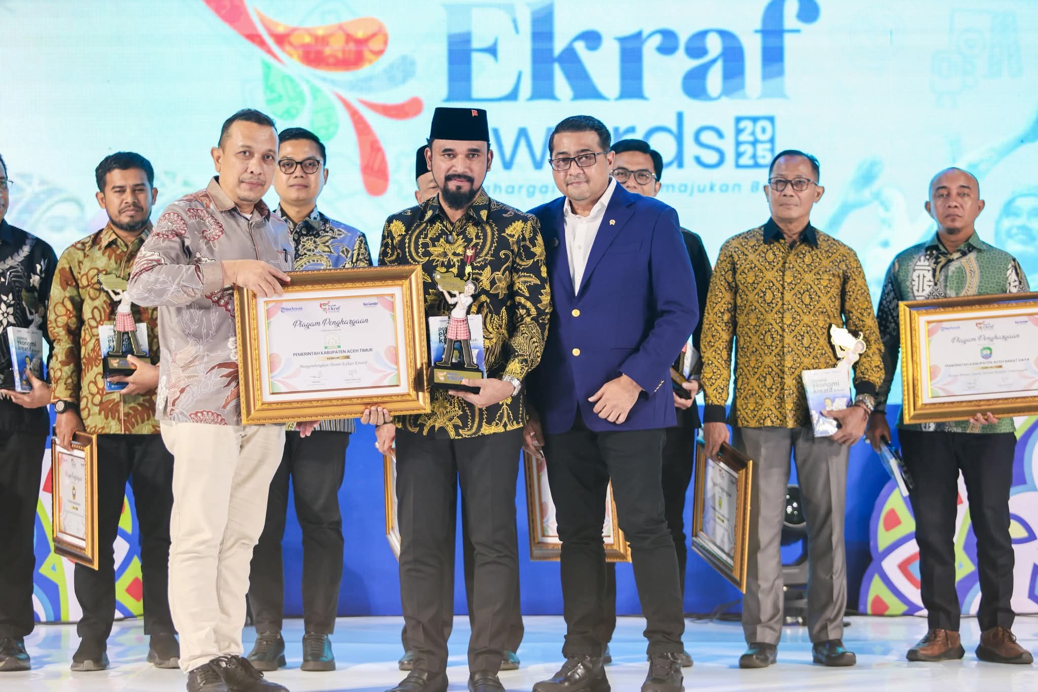 RILIS.NET, BANDA ACEH – Bupati Aceh Timur, Iskandar Usman Al-Farlaky SHI MSi menerima penghargaan Serambi Ekraf Award 2025 yang diserahkan langsung oleh Menteri Ekonomi Kreatif Republik Indonesia, Teuku Riefky Harsya, pada malam penganugerahan di Banda Aceh, Jumat (29/8/2025).