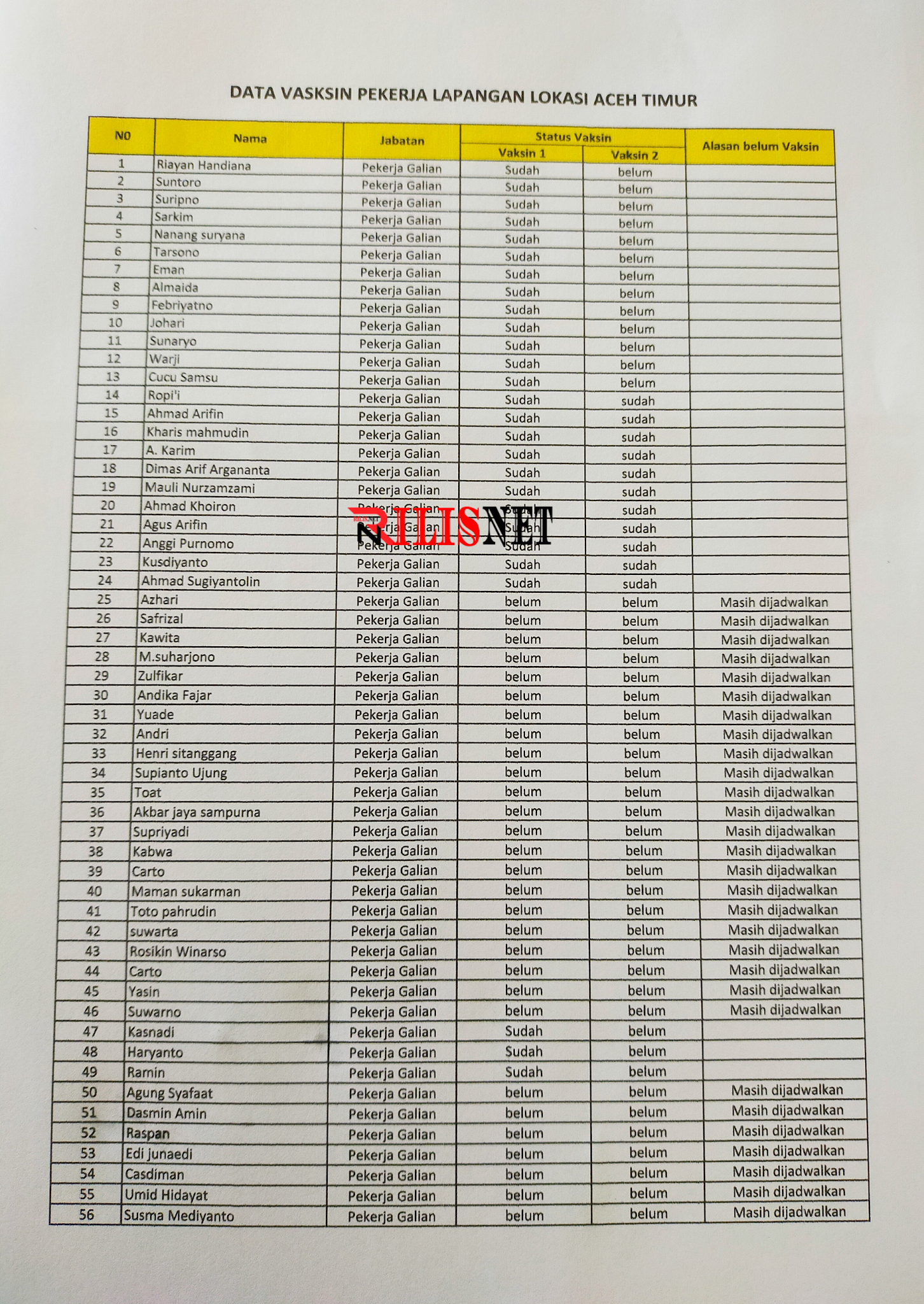 .NET, Aceh Timur – Tak kurang dari delapan puluh lebih para pekerja pemasangan jaringan gas (Jargas) dari PT Adhi Karya di Aceh Timur belum divaksinasi tahap dua, dan lebih kurang 30 orang diantaranya juga belum divaksinasi sama sekali. Hal ini dianggap sangat rawan terjadinya penyebaran kasus Covid-19 di Aceh Timur.Maklum saja, para pekerja ini yang berjumlah sekitar 129 orang disinyalir dari zona merah penyebaran Covid-19, dan berasal dari luar Provinsi Aceh.