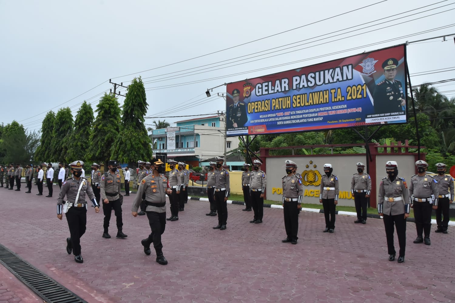 RILIS.NET, Aceh Timur – Kepala Kepolisian Resor Aceh Timur AKBP Mahmun Hari Sandy Sinurat, S.I.K memimpin pelaksanaan Apel Gelar Pasukan Operasi Patuh Seulawah-2021 dalam rangka cipta kondisi Kamseltibcarlantas di tengah pandemi COVID-19.
