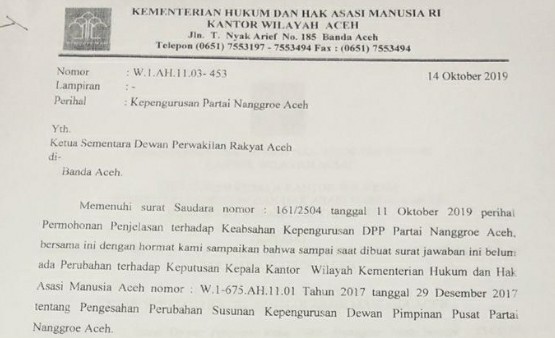 Dalam surat yang dikeluarkan oleh Kemenkumham Aceh, dengan nomor W.1.AH.11.03-453, tertanggal 14 Oktober 2019, yang diteken langsung oleh Kepala Kantor Wilayah Aceh, Lilik Sujandi, menegaskan bahwa belum adanya perubahan dari kepengurusan awal partai PNA.