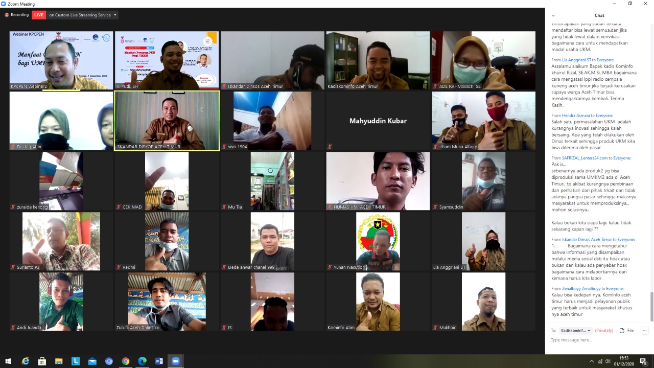 RILIS.NET, Aceh Timur – Dinas Komunikasi dan Informatika Kabupatrn Aceh Timur kerjasama dengan Komite Penanganan Covid-19 dan Pemulihan Ekonomi Nasional (KPCPEN) menggelar Webinar tentang manfaat program Pemulihan Ekonomi Nasional (PEN) secara virtual via Zoom Meeting, Selasa (1/12/2020).