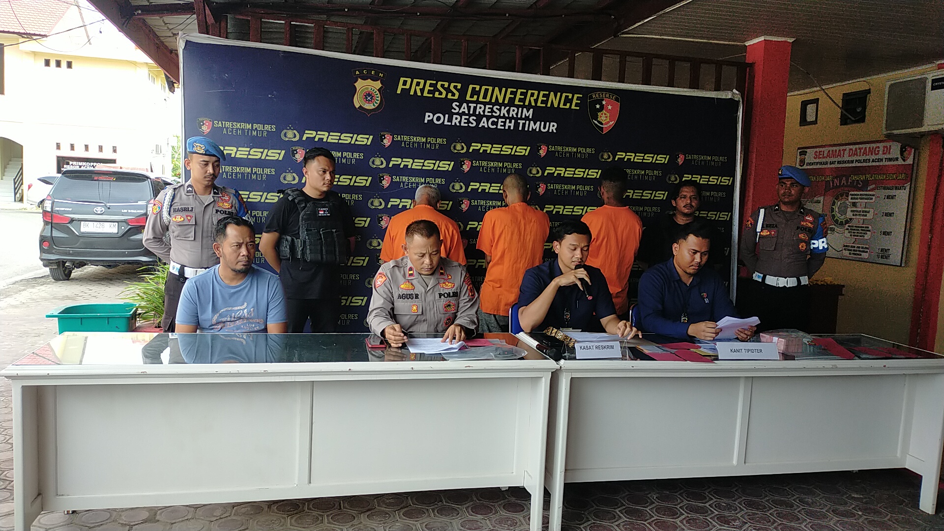Kasat Reskrim Polres Aceh Timur Iptu Adi Wahyu Nurhidayat, S.TrK.,S.I.K. saat menggelar Konferensi Pers, Selasa, (05/11/2024) siang menyebutkan, pelaku yang pertama kali diamankan pada pukul 14.05 WIB adalah IS, 38 tahun, warga Kabupaten Aceh Timur dan MH, 41 tahun warga negara Myanmar. Pada hari yang sama sekira pukul 19.00 WIB Tim kembali mengamankan AY, 64 tahun, warga Kabupaten Aceh Timur di pesisir pantai Kuala Bugak, Kecamatan Peureulak.