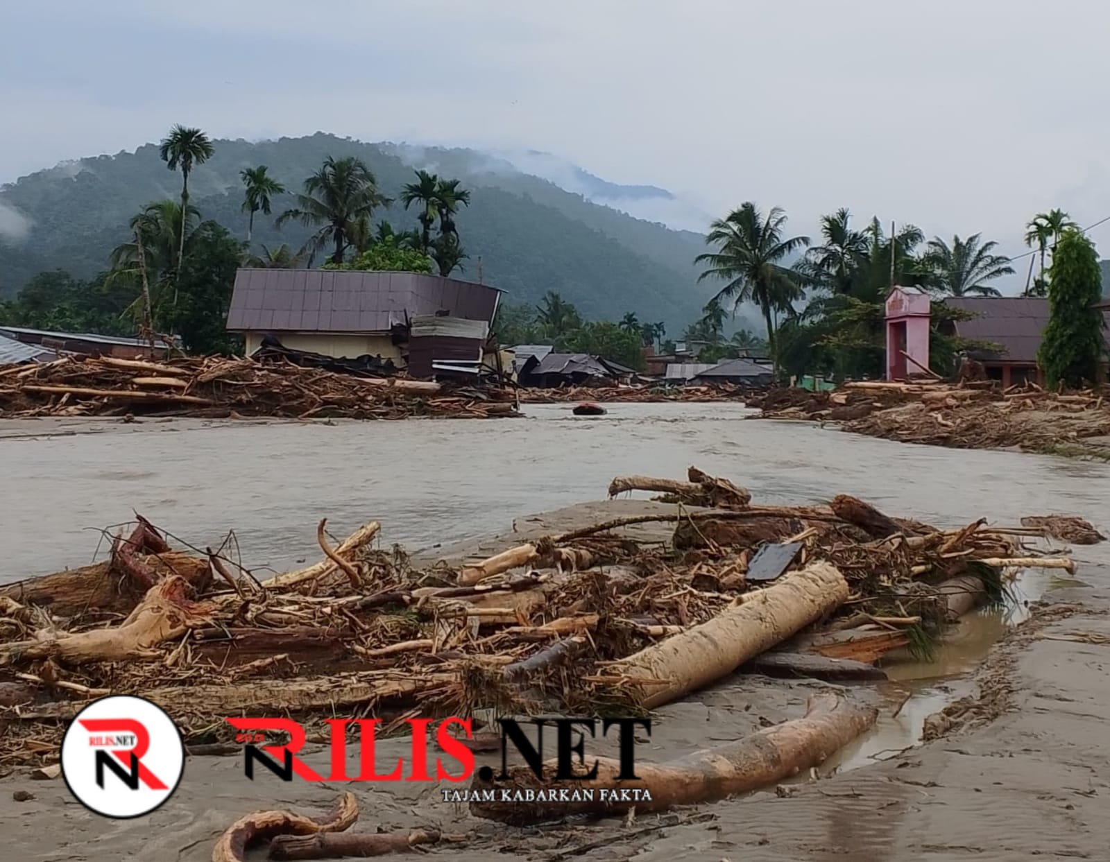 Banjir Bandang dan Longsor Terjang Lokop Aceh Timur. (Foto: material kayu yang terbawa banjir bandang penuhi pemukiman warga/dok rilis.net)