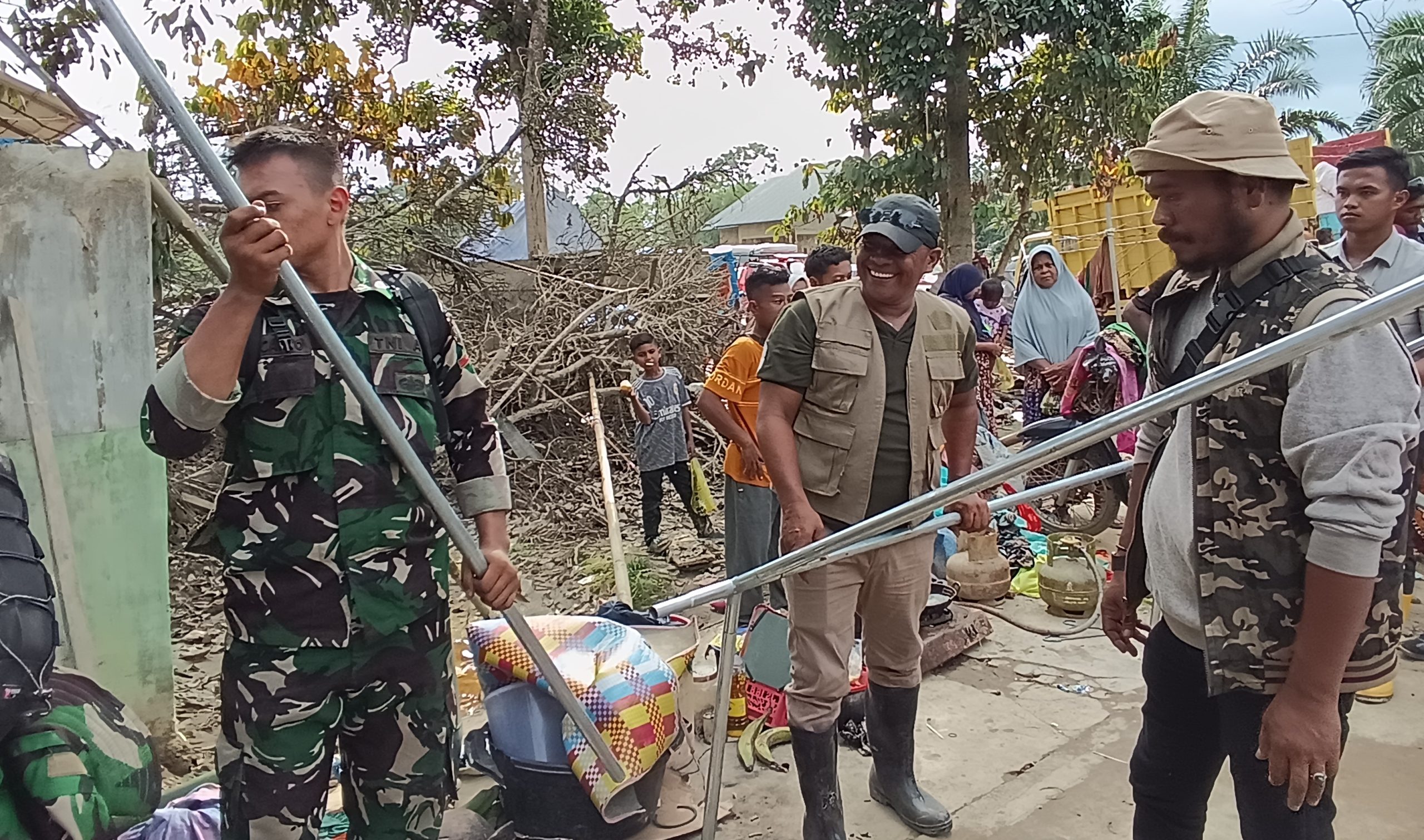 RILIS.NET, ACEH TIMUR – Mantan kombatan GAM di wilayah Peureulak, Aceh Timur terlihat kompak bersama personil TNI dari Yonif TP 853/BRB Peudawa untuk memasangkan tenda kepada para mengungsi korban bencana banjir bandang, yang menerjang kawasan desa Alue Ie Mirah, kecamatan Pante Bidari, Aceh Timur. Rabu (24/12/2025).