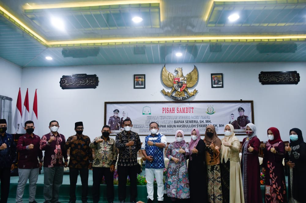 RILIS.NET, Aceh Timur – Pemerintah Kabupaten (Pemkab) Aceh Timur menggelar prosesi pisah sambut Kepala Kejaksaan Negeri (Kajari) Aceh Timur dari Abun Hasbulloh Syambas, SH, MH (sekarang menjadi Kajari Kabupaten Pekalongan) kepada penjabat yang baru Semeru, SH, MH, yang berlangsung di aula Pendopo Bupati Aceh Timur, Selasa (2/3/2021) malam.