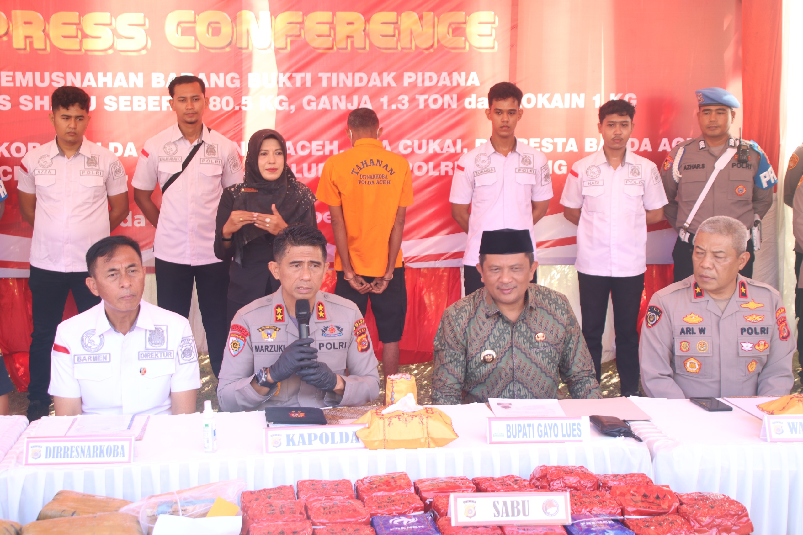 RILIS.NET, BANDA ACEH – Ditresnarkoba Polda Aceh bersama Badan Narkotika Nasional Provinsi (BNNP) Aceh, Direktorat Jenderal Bea dan Cukai, Polresta Banda Aceh, Polres Aceh Timur, Polres Gayo Lues, dan Polres Sabang berhasil menggagalkan peredaran narkotika jenis sabu seberat 80,5 kilogram, ganja 1,3 ton, serta kokain 1 kilogram dalam kurun waktu tiga bulan terakhir.