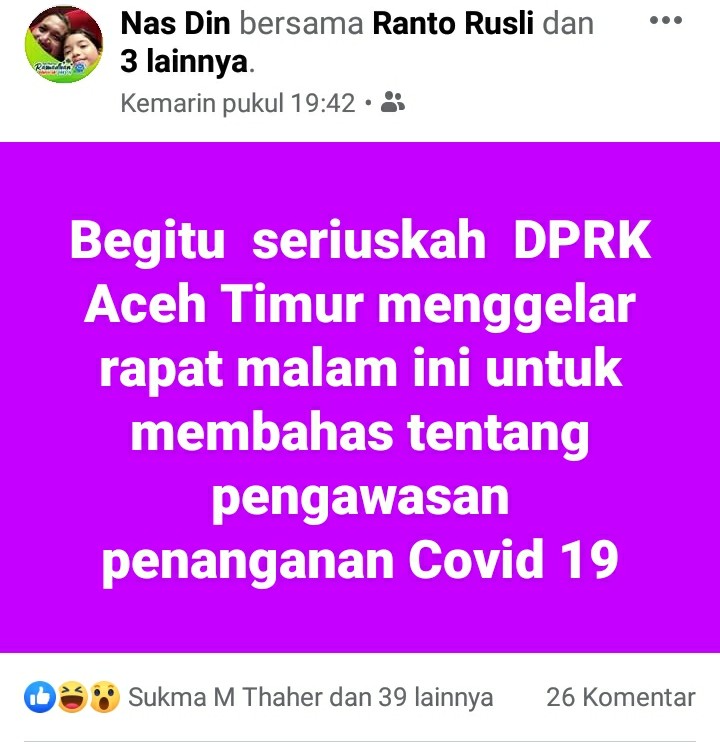 Rapat Dana Covid-19 Tengah Malam, DPRK Aceh Timur Jadi Tanda Tanya Warganet Mei 2, 2020