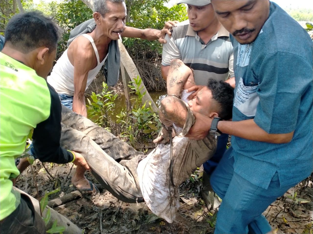 | Korban Saat di Evakuasi dari Pinggir Sungai Dekat Jembatan Alue Nireh, Selasa (17/3/2020) |